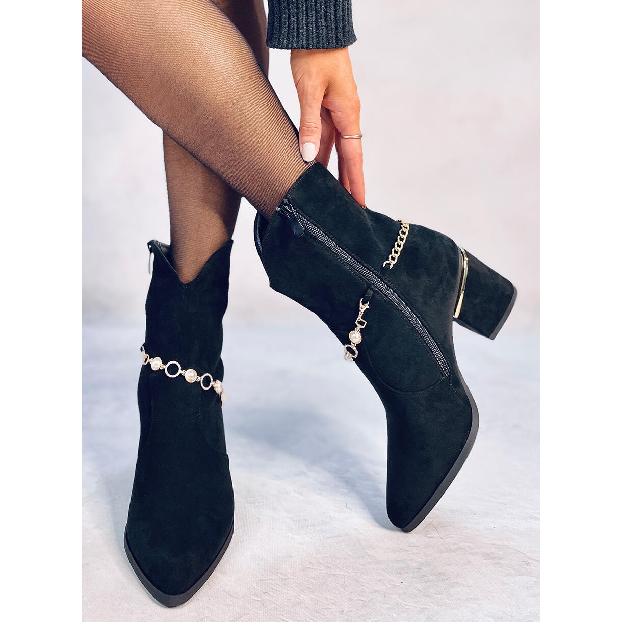Le produit est des bottines à talons hauts pour femmes avec une chaîne. Ces bottes sont noires et fabriquées en daim écologique. La forme des bottes ressemble à celle des bottes de cowboy et le bout effilé en amande donne au pied un look élancé. L'un des éléments les plus caractéristiques de ces chaussures est une chaîne spectaculaire parsemée de pierres et de perles brillantes.