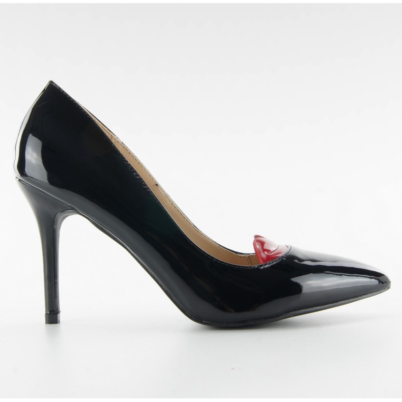 Escarpins noirs originaux avec motif lèvres - un accessoire féminin qui attire l'attention. La tige laquée en noir classique est complétée par un accent distinctif sous la forme de lèvres rouges sur la pointe, qui donne aux chaussures un caractère original et tendance. Un stylet de 9,5 cm de haut affine optiquement la silhouette tout en conservant un style de soirée élégant.