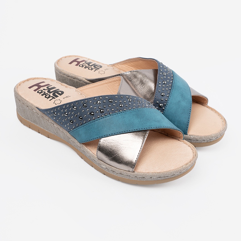 Fabriqué en imitación de peau de haute qualité, à la fois le haut et la partie intérieure, garantissent non seulement une apparence à la mode, mais aussi le réconfort tout au long de la journée. Le talon ouvert et l'absence de nez sont des détails qui ajoutent de la légèreté et de la respirabilité, et les goujons en argent donnent aux volets un personnage moderne.