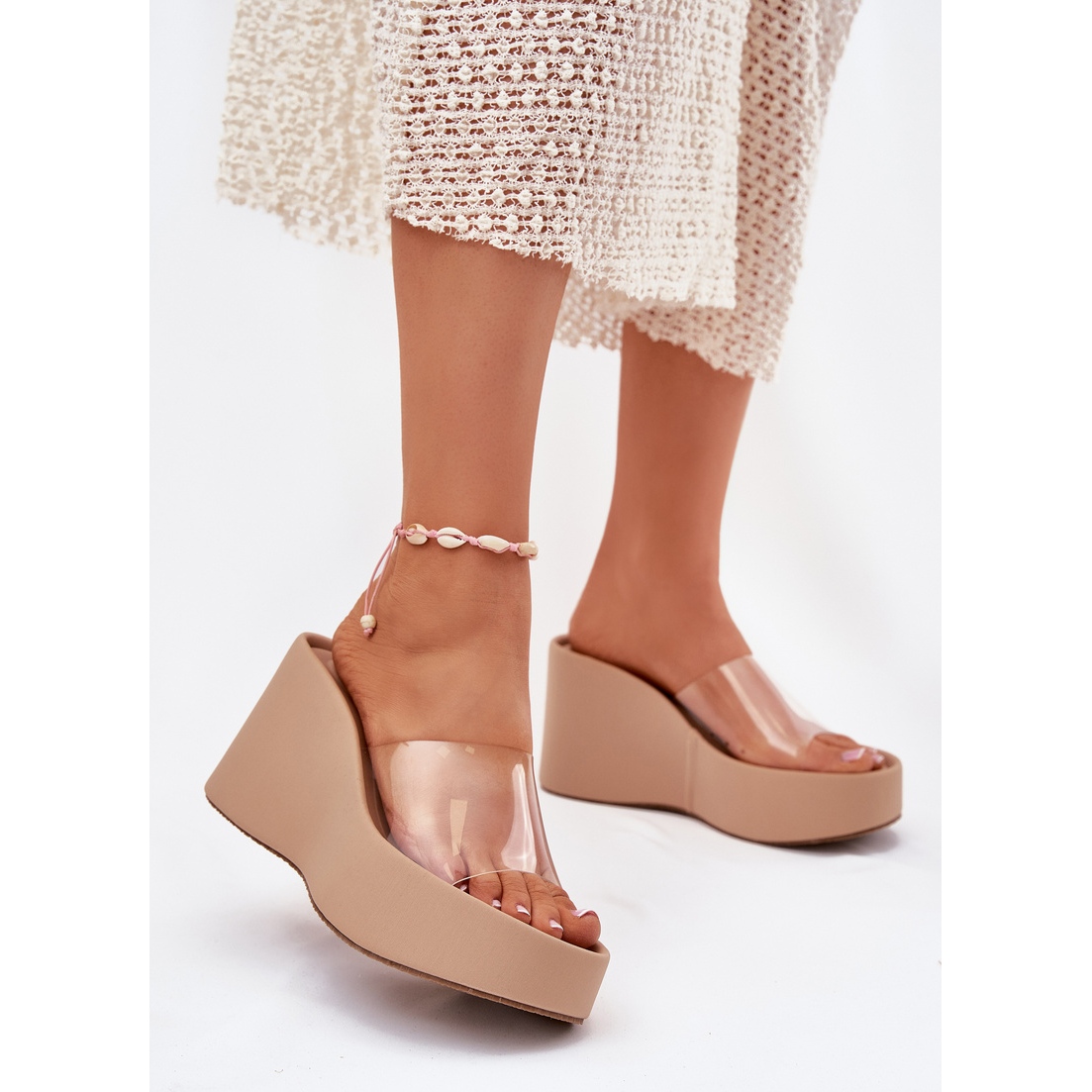 Les tongs pour femmes en coin avec une teinte beige transparente sont le choix parfait pour les femmes qui veulent combiner le confort avec le style à la mode. Intitulés sur les coins d'une hauteur de 10 cm, ces tongs offrent non seulement une stabilité, mais aussi une extension optique des jambes. Grâce à la plate-forme de 5 cm de haut, les promenades quotidiennes deviennent un plaisir et vos pieds se sentiront à l'aise toute la journée.