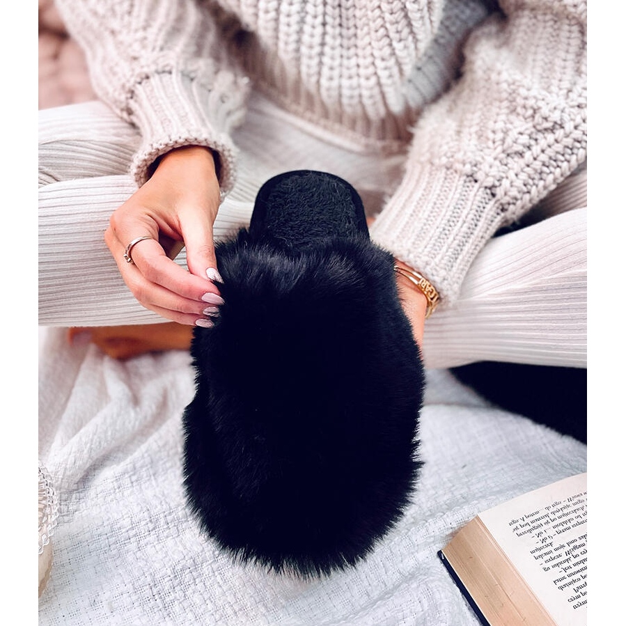Le design de ces pantoufles combine des caractéristiques classiques : elles sont noires, ce qui les rend assorties à la plupart des tenues de la maison, elles ont un bout rond et sont décorées d'une fourrure douce supplémentaire. Grâce au talon plat, elles offrent stabilité et confort lors des promenades dans la maison.