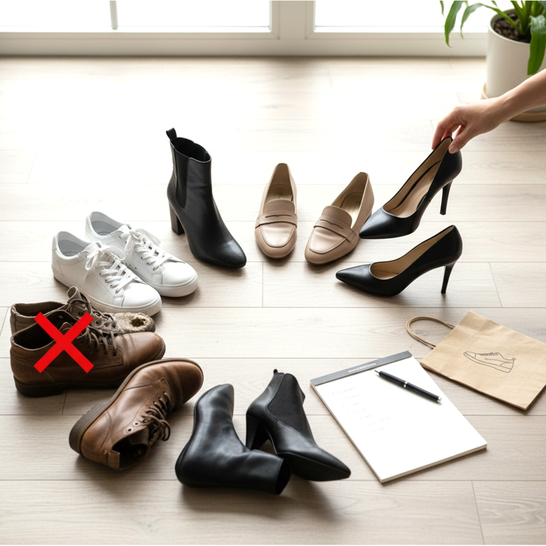 Construire une garde-robe capsule est un processus et non un achat ponctuel. Commencez par auditer votre collection de chaussures actuelle : sortez toutes les chaussures du placard, évaluez leur état, leur utilité et la fréquence à laquelle vous les portez. Débarrassez-vous des paires usées, inconfortables ou qui ne vont tout simplement pas avec quoi que ce soit. Identifiez ensuite les lacunes : laquelle des cinq catégories clés manque dans votre garde-robe ?
