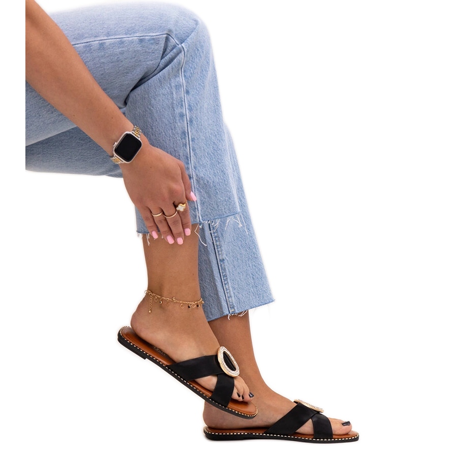 Découvrez les tongs uniques décorés d'une boucle dans les strass salimb dans une couleur noire classique, qui est une excellente proposition de chaudes journées d'été. Ces tongs élégants et insérés combinent le confort et l'élégance, grâce à laquelle ils seront le complément parfait à votre stylisation estivale.