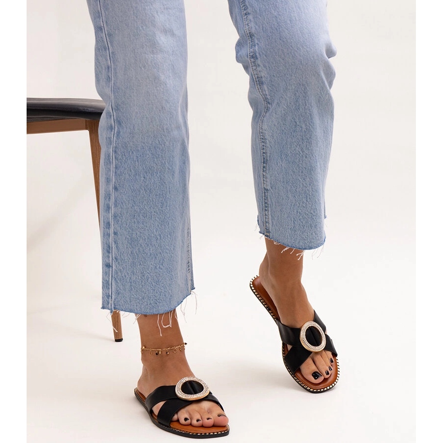 La couleur noire du matériau extérieur et de la semelle rend ces chaussures faciles à assortir à la plupart des styles, et l'accent doré des zircons leur donne un caractère unique. Un avantage supplémentaire est le confort de port grâce à la semelle en caoutchouc souple et flexible et au cuir écologique utilisé pour fabriquer la semelle intérieure.
