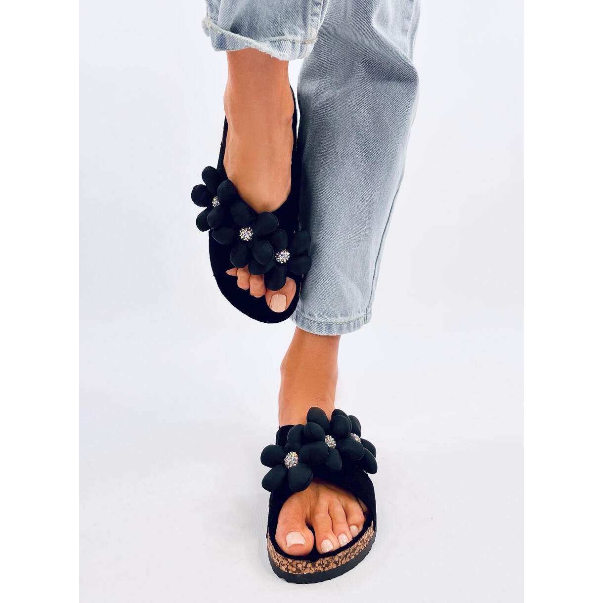 Détails: Charss Tongs en liège noir avec fleurs coussin
