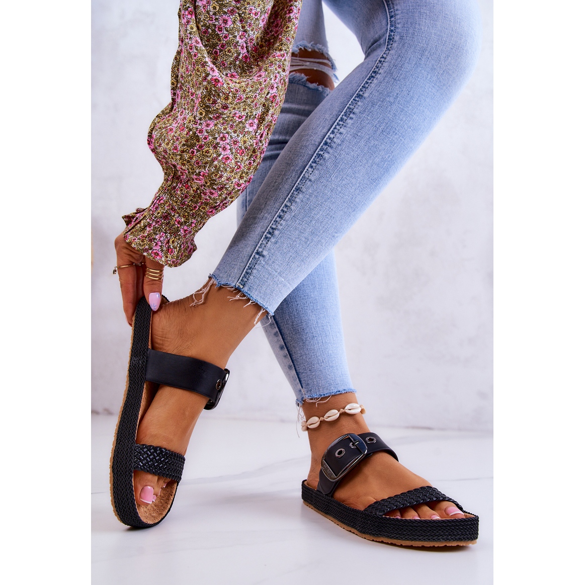 Pantoufles à la mode de la marque Big Star. Fabriqué en cuir écologique de haute qualité. Semelle intérieure profilée en liège. La semelle est en matière caoutchouc, antidérapante, ornée d'une tresse. Modèle à enfiler, fermé en plus par une boucle. Il a une sangle réglable que vous pouvez ajuster correctement à la largeur de la jambe. Les chaussures ont fière allure sur la jambe! Vous devriez les avoir dans votre collection de tongs ! Lorsque vous choisissez une taille, veuillez utiliser le tableau des tailles.