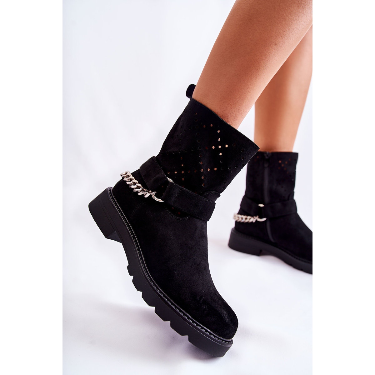 Nous vous présentons des bottines ajourées avec une fermeture éclair et une chaîne en noir ! Ces bottines uniques pour femmes allient élégance et confort, ce qui en fait un choix parfait pour diverses occasions. Fabriqués en éco-daim de haute qualité, ils séduisent par leur motif ajouré qui leur confère légèreté et un caractère tendance.