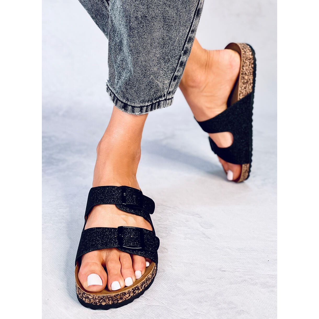 Les "tongs Alexa Black Glitter Cork" sont des tongs noires élégantes pour femmes au look décontracté. Ils sont le complément parfait aux styles d’été à porter au quotidien. Le produit combine l'élégance des paillettes avec le cuir mat écologique, qui a été utilisé pour créer la partie extérieure de la chaussure. Les boucles permettent un ajustement au pied et la semelle intérieure profilée, également en cuir écologique, garantit un port confortable.