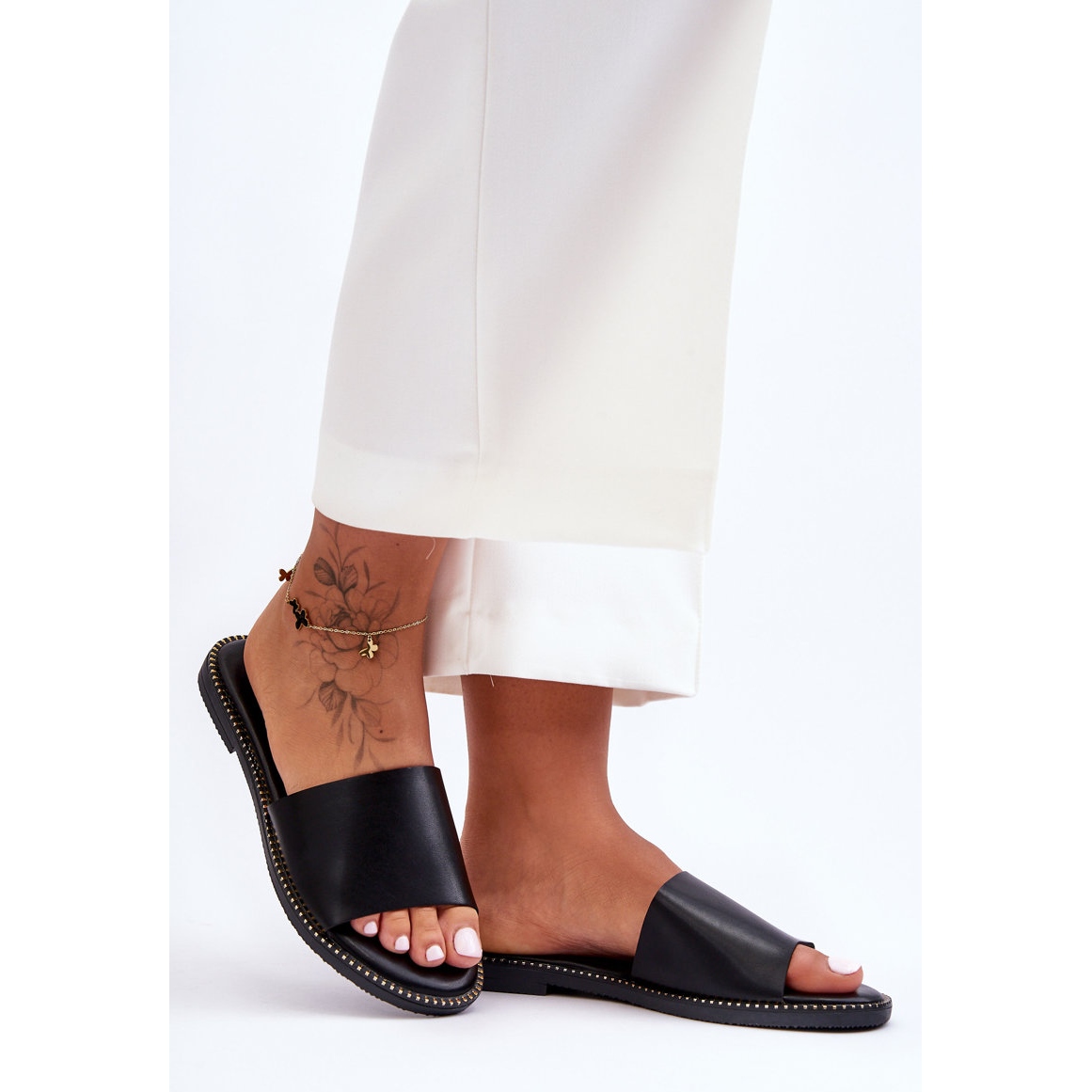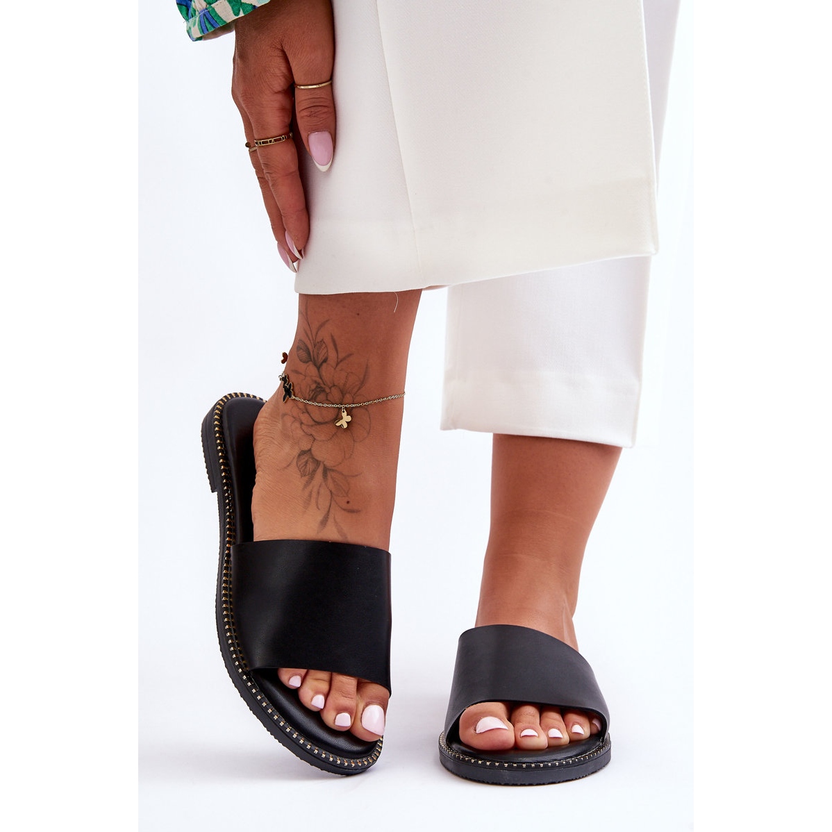 Disponibles en noir classique, ces claquettes seront le complément parfait à votre garde-robe. Ils s'associent parfaitement aussi bien aux robes d'été qu'aux tenues décontractées avec un jean ou un short. Des éléments dorés supplémentaires, tels que des strass et des clous, ajoutent un peu de sex-appeal, ce qui en fait le choix parfait pour toute occasion.