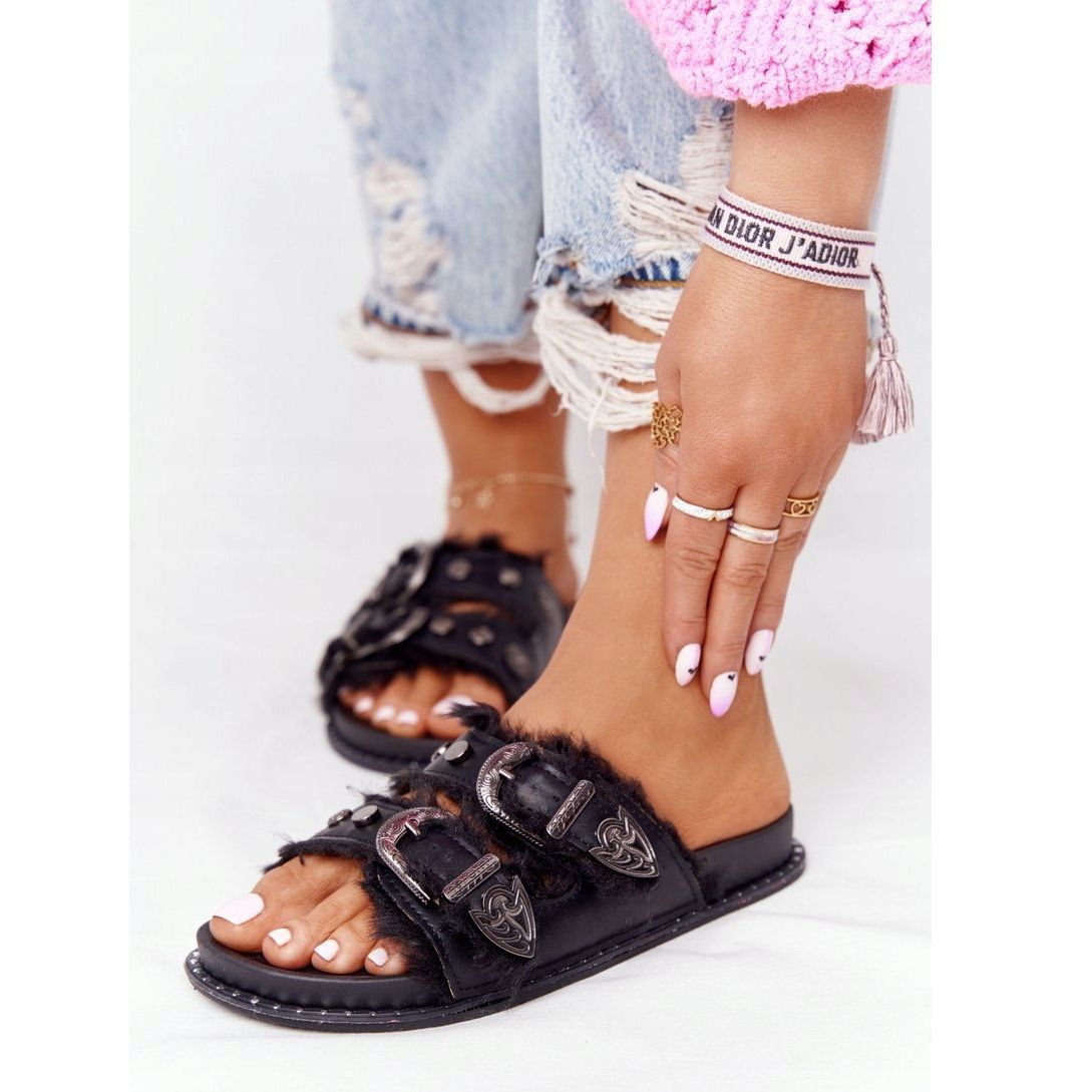 Nous présentons les tongs PS1 uniques pour femmes en noir, qui allient confort et design à la mode. Le modèle Lydia se distingue par une semelle intérieure profilée qui le rend confortable à porter toute la journée. La tige des tongs est ornée d'élégantes boucles argentées et d'une douce fourrure écologique, ce qui en fait le complément parfait au style estival.