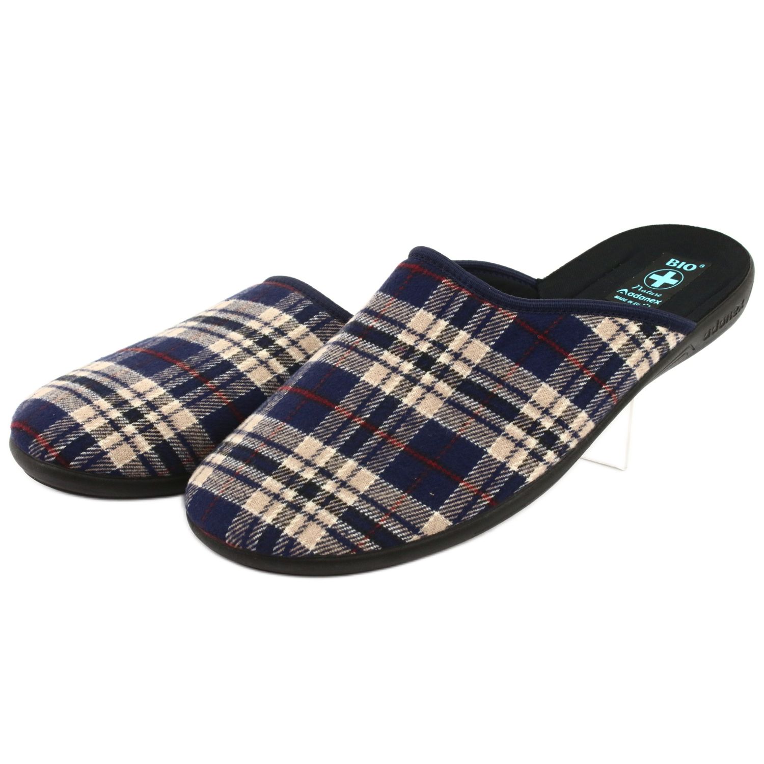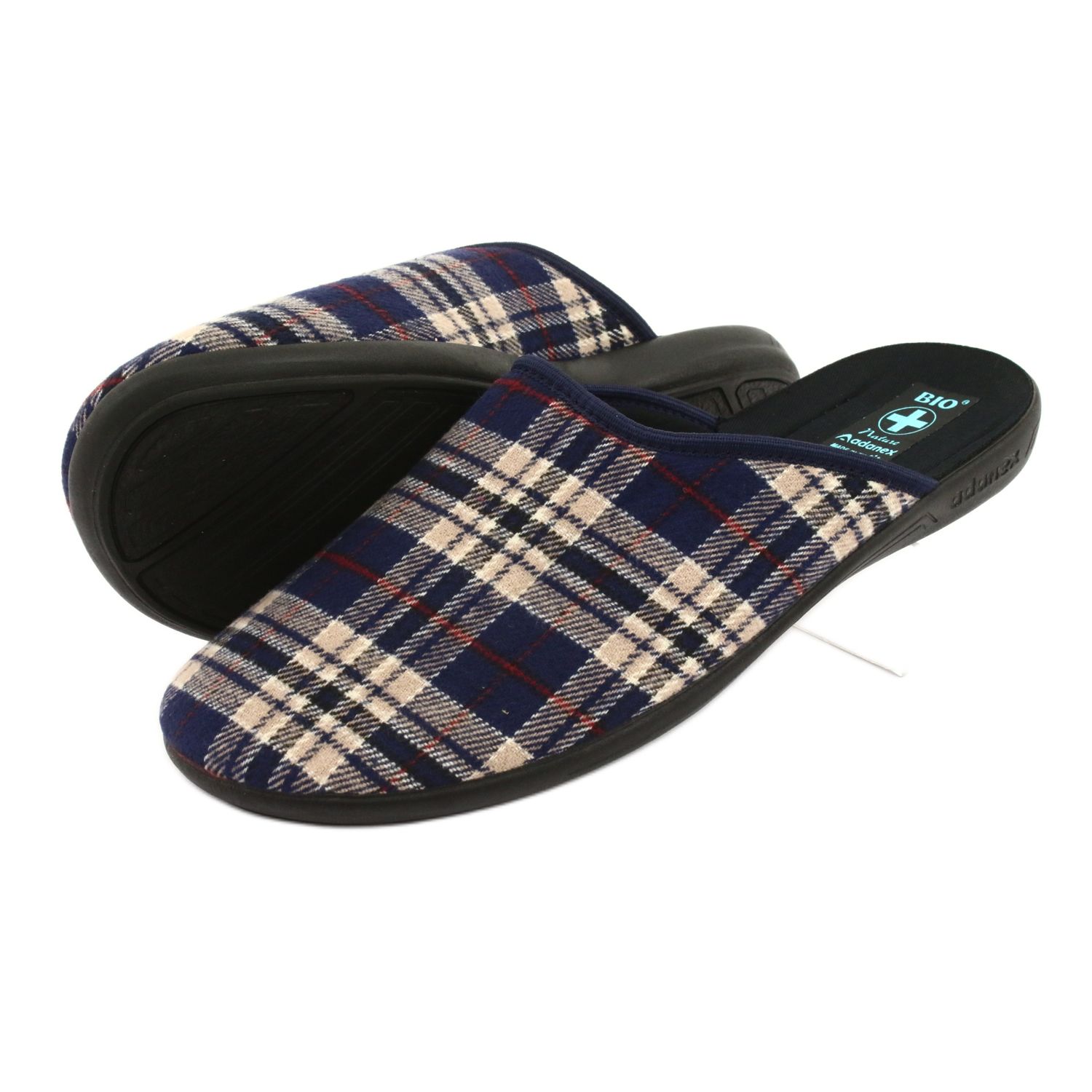 Nous vous présentons les pantoufles pour hommes Adanex 24271, parfaites pour un usage domestique pour tout homme qui apprécie le confort et le style. Fabriqués dans un tissu de haute qualité, ces chaussons arborent une couverture moelleuse au délicat motif à carreaux bleu marine et beige, qui leur donne un look moderne.