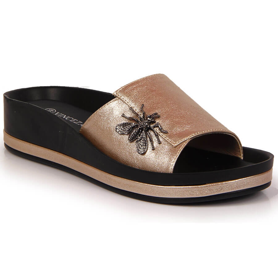 Nous vous présentons les chaussons compensés pour femmes à motif nœud papillon de la marque Vinceza dans une élégante couleur dorée. Ces tongs extrêmement élégantes allient un design tendance à un confort exceptionnel, ce qui en fait le choix parfait pour les journées d'été.