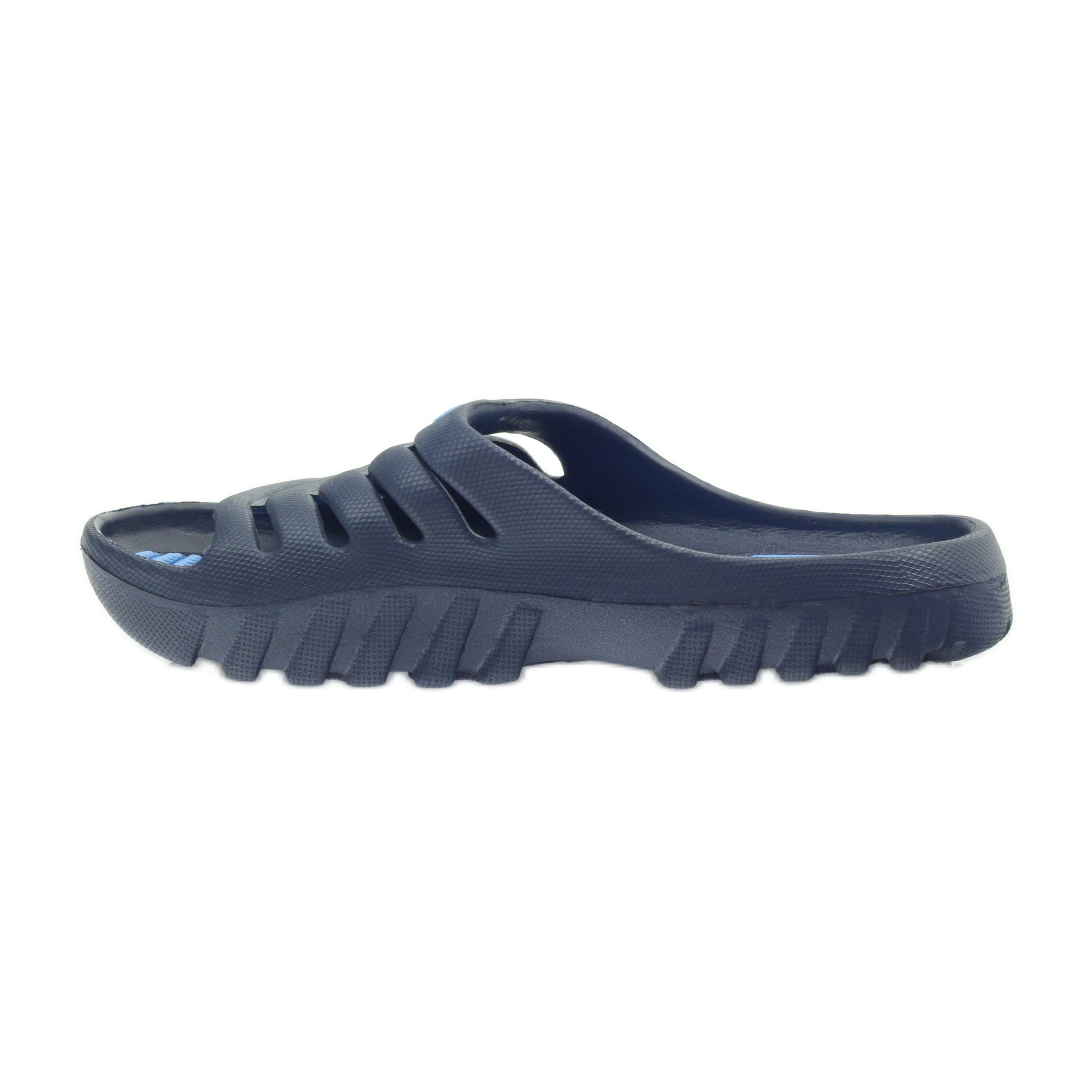 Ces tongs bleu marine se distinguent par une forme intéressante de la tige, et le logo du fabricant leur donne du caractère. L'intérieur des chaussures de couleur bleu intense avec une semelle profilée garantit aux pieds de votre enfant un soutien et un confort adéquats tout au long de la journée.
