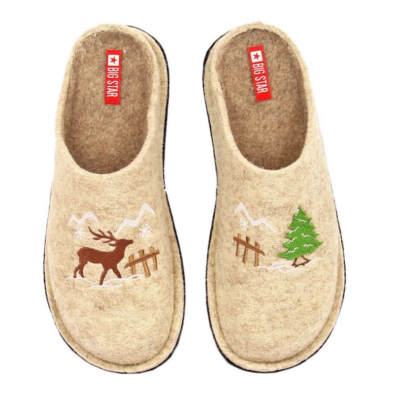Slippers à domicile confortables et élégantes Big Star INT1803A dans une couleur beige universelle - parfait pour les matins plus frais et les soirs à la maison. Fabriqués en feuilles molles en combinaison avec une tige synthétique, ils offrent une agréable sensation de douceur et un bon contact avec le sol. La coupe classique et basse avec une orteil ronde et la broderie de Noël leur ajoute du charme, et le logo du fabricant discret souligne la qualité de la finition.