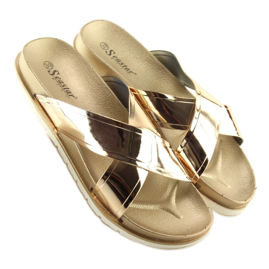 Ce sont les tongs dorées au look miroir doré CK46P - le choix parfait pour les journées d'été ! Ces tongs pour femmes se distinguent non seulement par leur couleur dorée très tendance, mais aussi par leurs brides croisées brillantes qui maintiennent parfaitement le pied. Grâce à la semelle flexible et profilée, chaque pas sera confortable, et la semelle blanche tendance au style sportif donnera à l'ensemble du style un caractère frais et moderne.