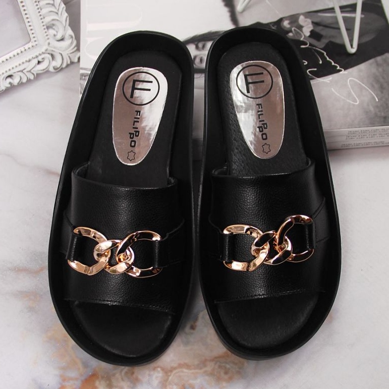 Flippo Élégants et confortables tongs, dont l'élégance est soulignée par une chaîne décorative. Parfait pour les jours d'été - ils combinent des matériaux naturels et durables avec un style urbain moderne. La tige et la doublure en cuir garantissent le confort et les couleurs noires universelles correspondent à de nombreux styles.