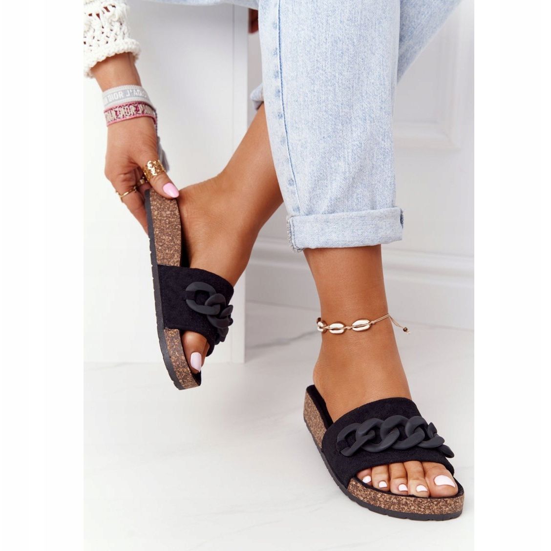 Ces tongs se distinguent par une subtile chaîne décorative, qui leur ajoute une touche d'élégance et les rend parfaitement assorties à différents styles. Grâce à la fermeture à enfiler, l'enfilage et le retrait sont rapides et pratiques. La semelle synthétique de 3 cm de hauteur assure stabilité et amorti, ce qui fait de chaque instant passé dans ces tongs un pur plaisir.