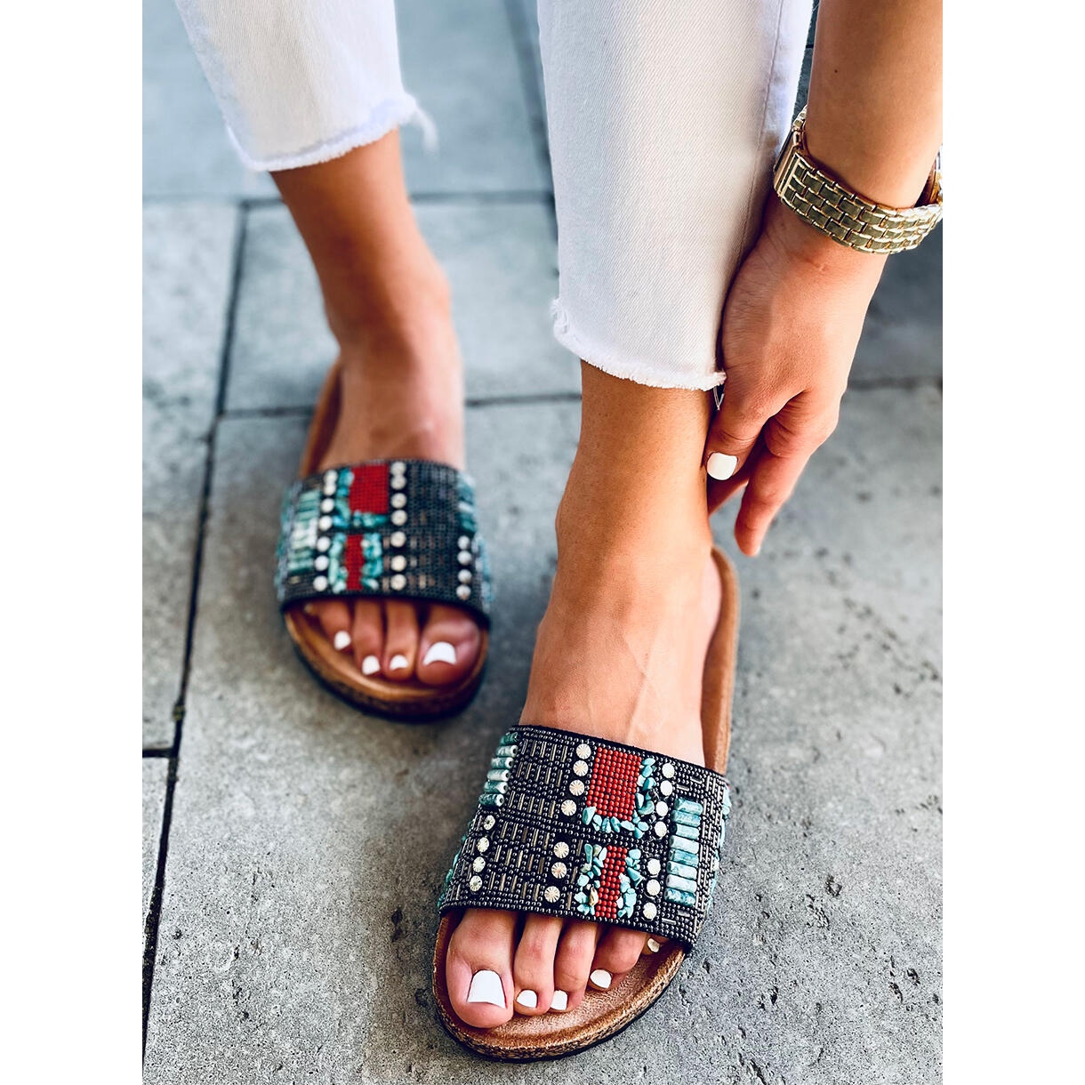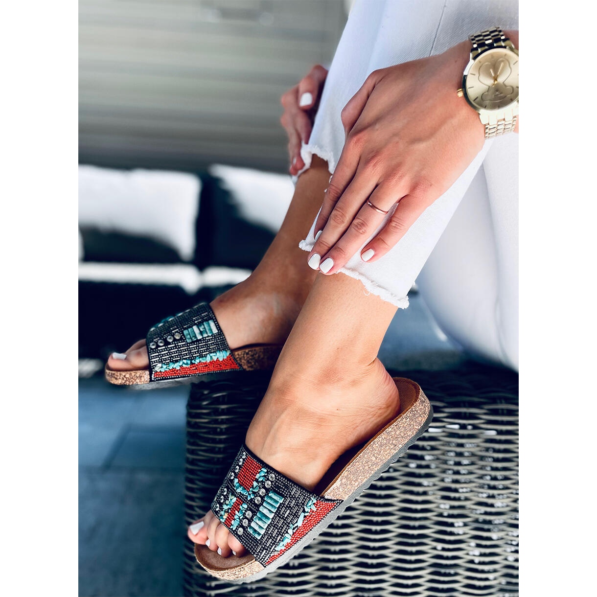 Les tongs en liège Taida Black en noir sont un excellent choix pour les femmes qui apprécient le confort et un look à la mode. Fabriqué en daim écologique de haute qualité, ce modèle est extrêmement élégant et des décorations impressionnantes de style ethno lui confèrent un caractère unique.