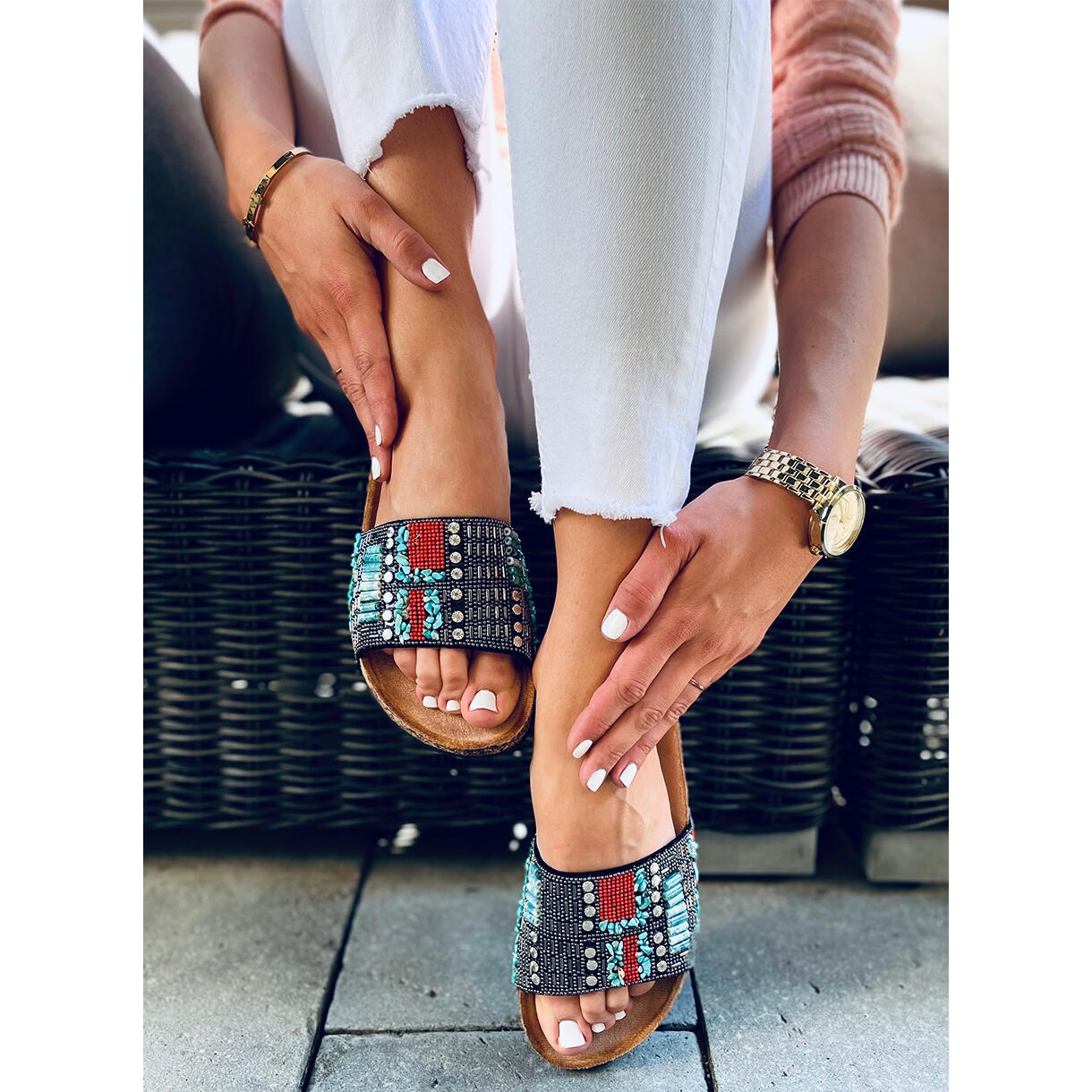 Les tongs Taida Black sont des chaussures décontractées qui seront parfaites pour un style quotidien. Grâce à leur design simple mais élégant, ils complèteront parfaitement les tenues d'été. Les strass et les pierres ajoutent une touche de glamour, ce qui les rend adaptés aussi bien au quotidien qu'aux occasions spéciales.