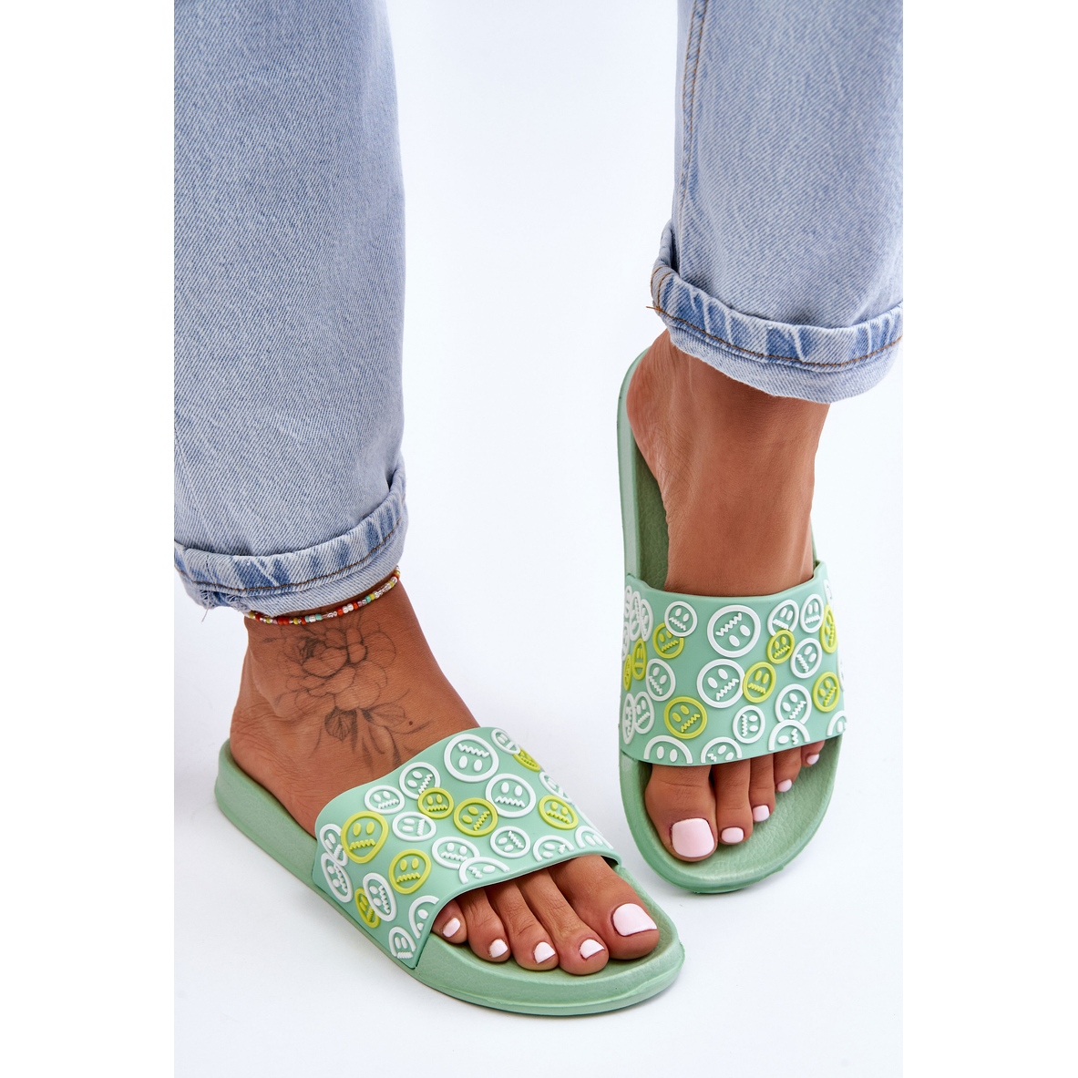 Slippers de Cosette pour femmes avec émoticônes - vert, léger et confortable. Parfait pour l'été, pour la plage, la piscine et pour un usage quotidien.