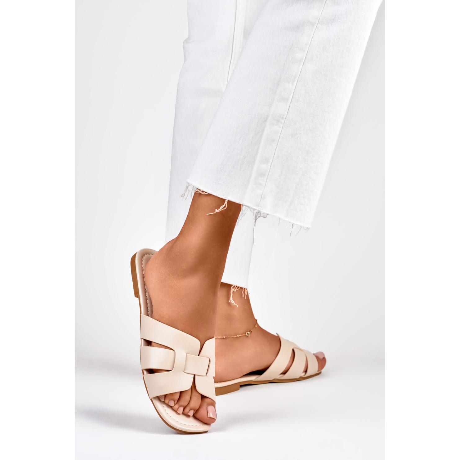 Les tongs sont fabriquées en cuir écologique beige de haute qualité, ce qui les rend non seulement esthétiques, mais également respectueuses de l'environnement. Ce matériau est facile à nettoyer et résistant aux dommages, ce qui prolonge considérablement la durée de vie des chaussures.