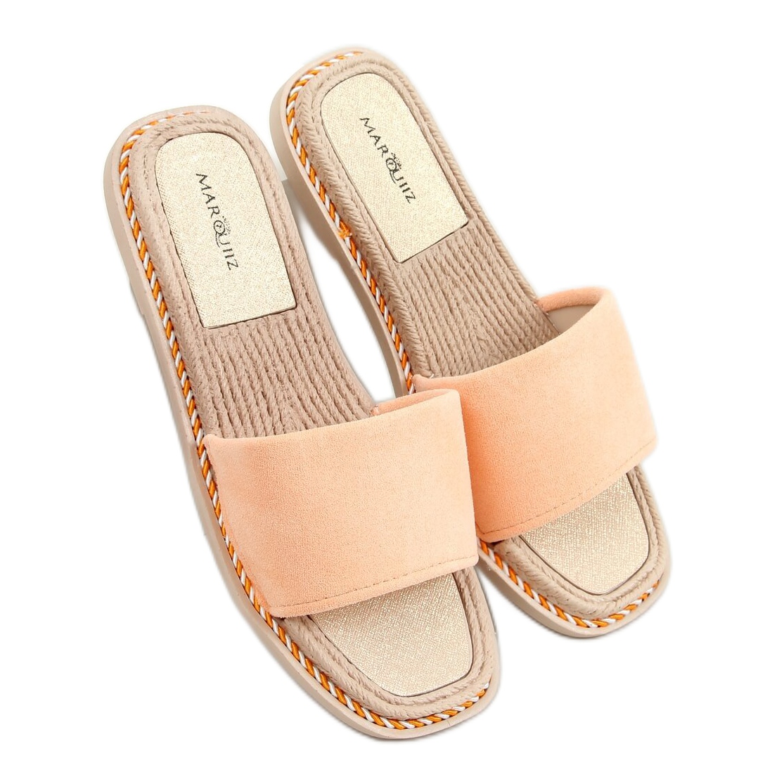 Il s'agit de babouches pour femmes en daim d'une belle teinte abricot, modèle 1096 Orange. Ces tongs élégantes sont le choix parfait pour l'été, alliant confort et look élégant. Fabriquées en daim écologique, elles maintiennent parfaitement le pied, ce qui les rend parfaites pour les aventures de vacances et les promenades quotidiennes.