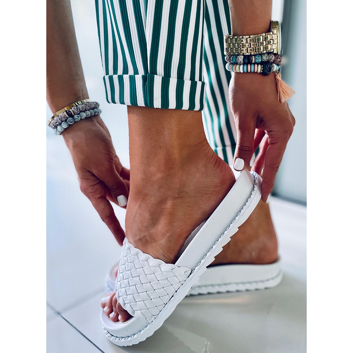 Ajoutez un peu de légèreté et d'élégance à votre garde-robe de tous les jours avec les tongs pour femmes Edna White. Ces tongs uniques se distinguent par une large bride tissée qui non seulement stabilise parfaitement le pied, mais leur confère également un caractère unique et tendance. Fabriqués en cuir écologique de haute qualité, ils assurent un confort de port tout au long de la journée.