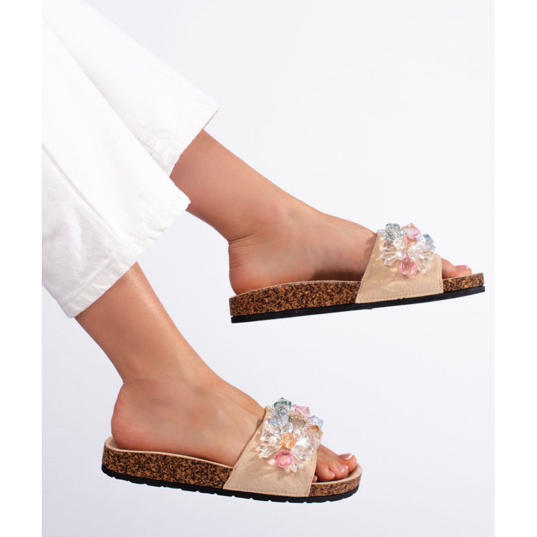 La partie supérieure des tongs est en cuir suédé écologique, qui imite parfaitement le daim naturel, et des décorations supplémentaires sous forme de zircons et de strass leur confèrent un caractère élégant et tendance. Les tongs n'ont pas de bout, ce qui les rend aérées et parfaites pour les journées d'été.