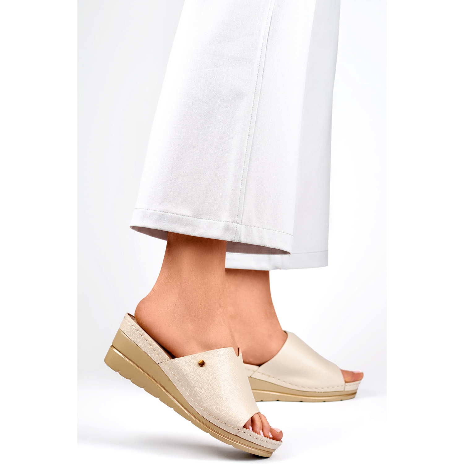 L'intérieur des volets est bordé de cuir naturel, ce qui assure une excellente ventilation et une absorption efficace de l'humidité. Grâce à cela, même pendant les longues heures de port, les pieds restent frais et secs. Le talon sous la forme d'un coin de 5 cm de haut leur donne un look élégant, tout en garantissant la stabilité et le confort à chaque étape.