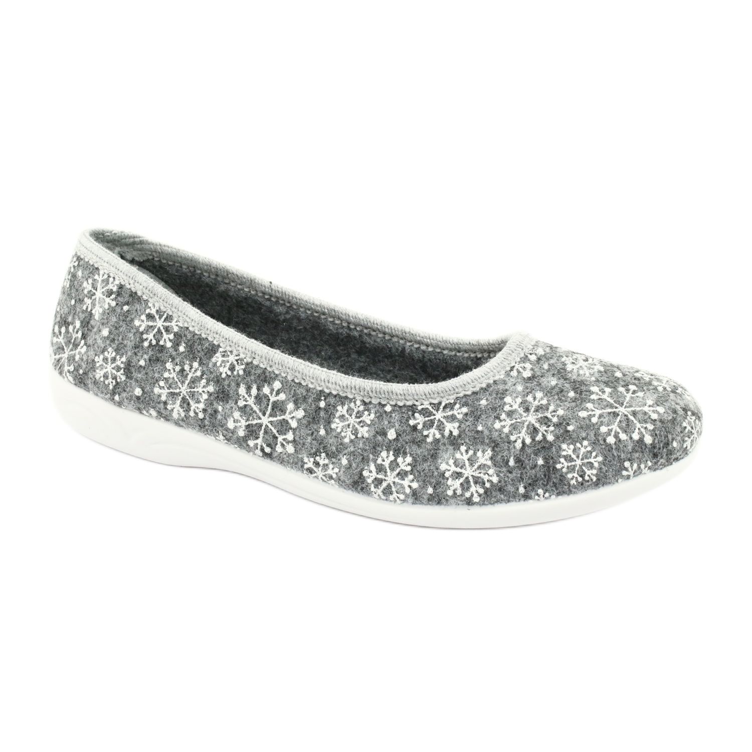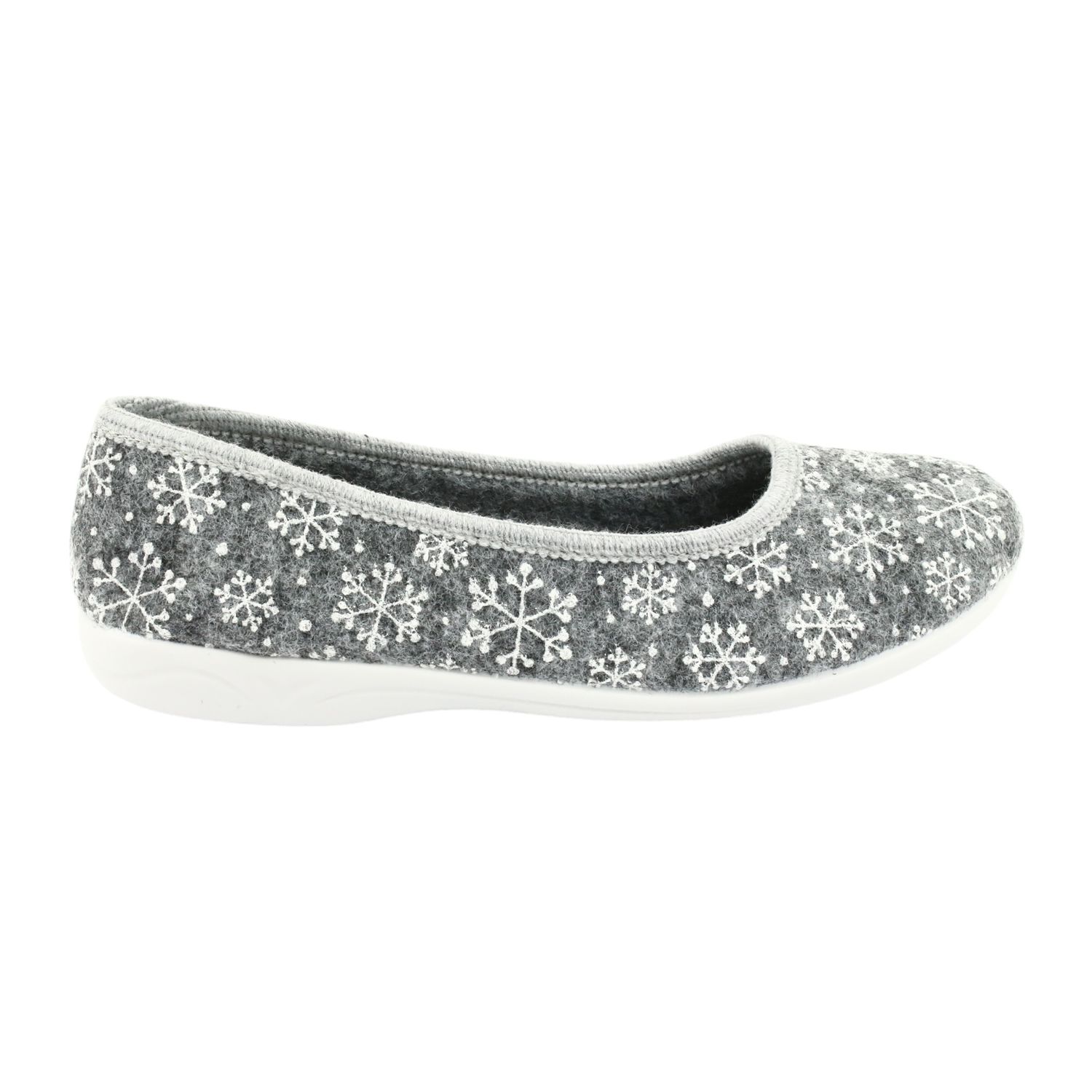 Les chaussons se déclinent dans des coloris gris et blanc élégants et sobres, ornés d'un délicat motif de flocons de neige, qui leur confère un caractère unique. Le nez rond et le design à enfiler les rendent faciles à enfiler, ce qui en fait le choix parfait pour toutes les saisons.