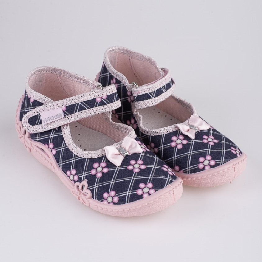 Des pantoufles délicates et pratiques Viggami Inka sont une proposition idéale pour les filles au quotidien. La tige textile avec un motif de rose bleu marine est légère et aérée, et un fester raide intégré stabilise le pied lors de la marche. La semelle intérieure en cuir offre un confort et une meilleure hygiène d'utilisation, et la doublure textile douce augmente le confort du port.
