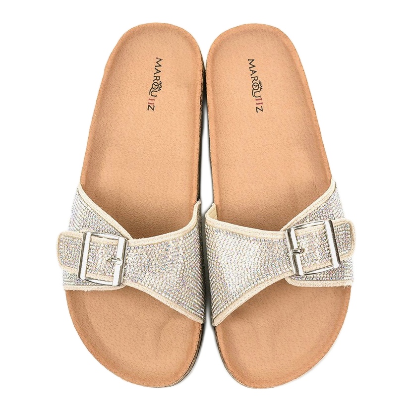 La tige des tongs est constituée de deux éléments reliés par une boucle argentée, ce qui leur confère un caractère unique. De plus, toute la surface est subtilement décorée de zircons scintillants, qui attirent l'attention et ajoutent de la brillance à n'importe quel style.