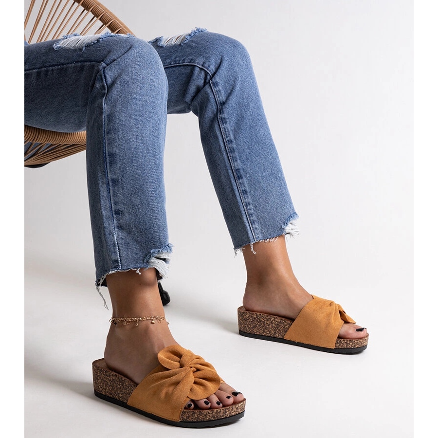 Le produit est extrêmement élégant grâce à l'utilisation de cuir suédé écologique de haute qualité dans une teinte camel tendance dans la partie supérieure de la chaussure. Un charmant nœud ajoute un charme subtil, ce qui rend ces tongs parfaites pour les tenues de tous les jours et plus élégantes.