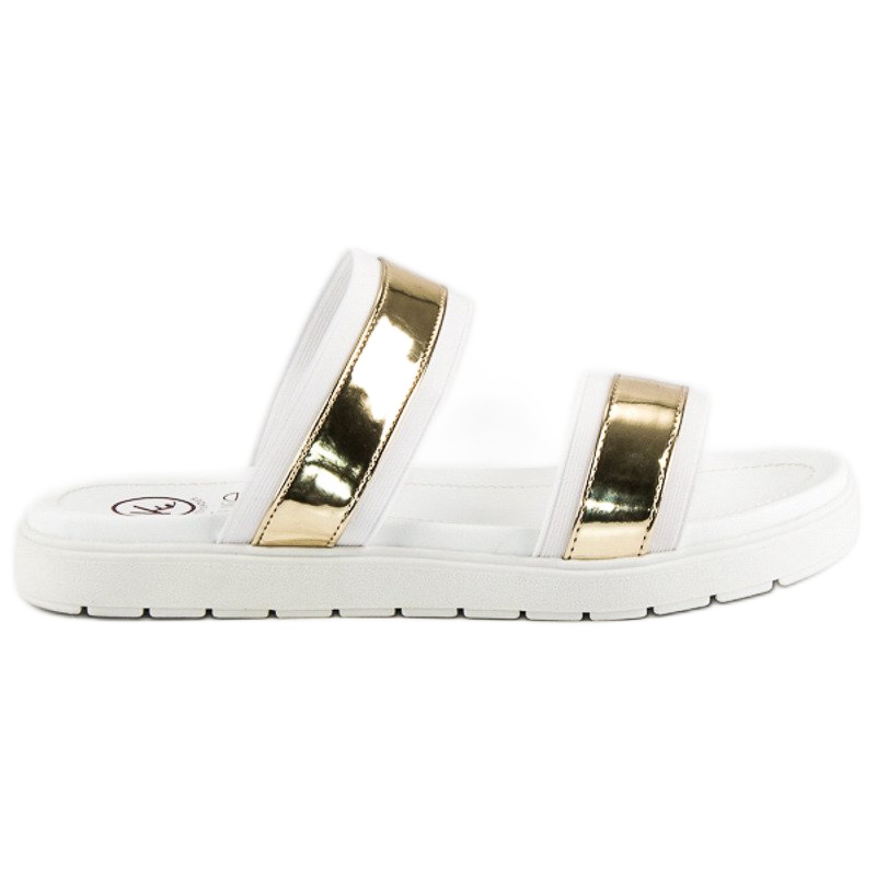 Deux brides épaisses, décorées d'éléments dorés, attirent non seulement l'attention, mais assurent également un maintien stable sur le pied, ce qui en fait un choix parfait pour un usage quotidien. Grâce au talon ouvert et au design slip-on, l'enfilage est rapide et intuitif, et la semelle en caoutchouc avec bande de roulement garantit la traction sur diverses surfaces.