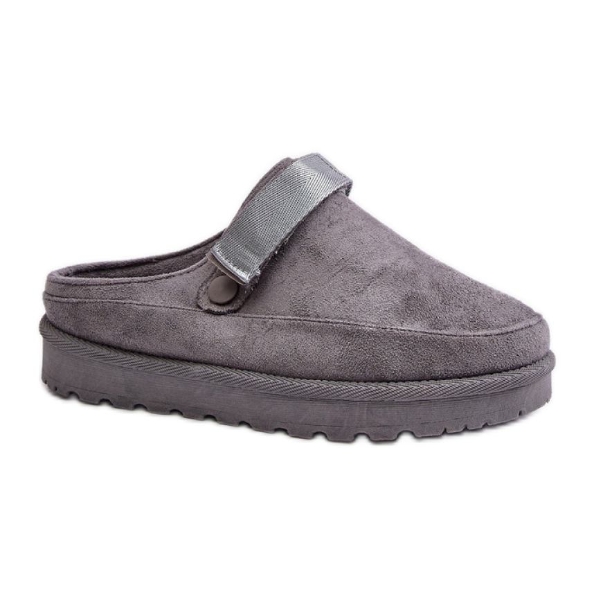 Tongs pour femmes en suède écologique. Monté sur une plateforme. L'intérieur est isolé avec une fourrure agréable, qui assure un confort lors des journées les plus froides. De plus, elles disposent d'une sangle mobile avec fermeture Velcro qui stabilise le talon et permet un ajustement parfait. Parfaits pour un usage quotidien, ils allient style et fonctionnalité.