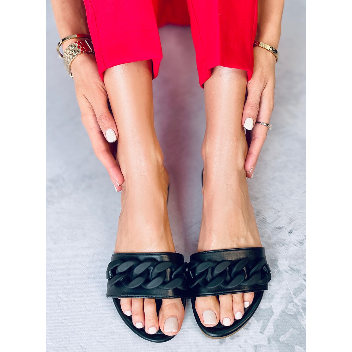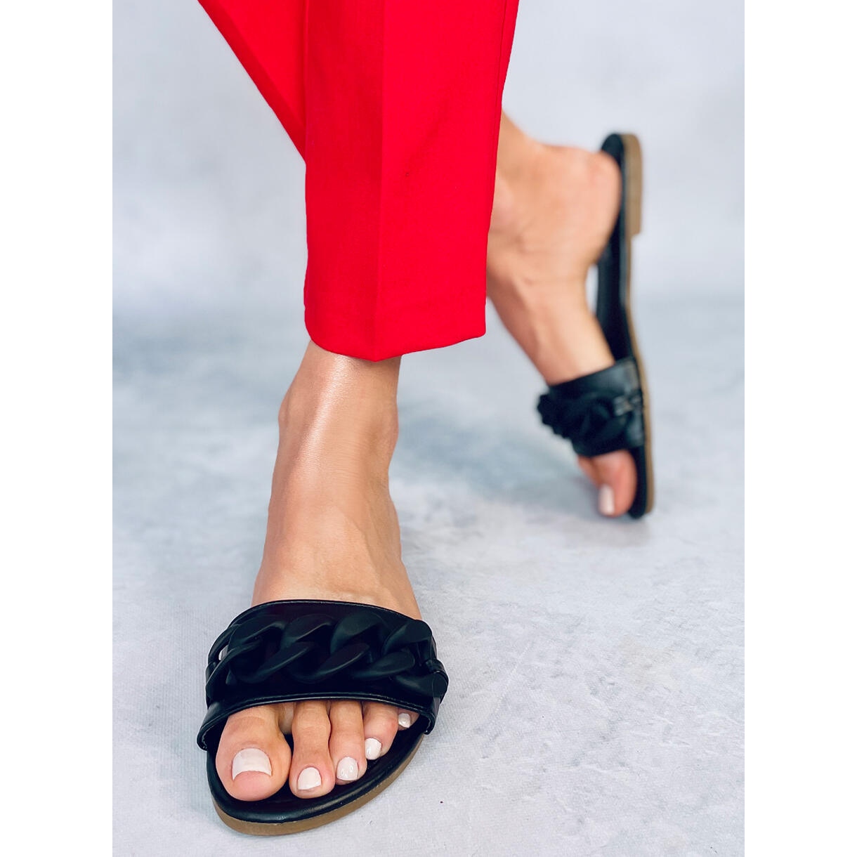 Nous vous présentons les tongs noires CK205P noires avec chaîne, parfaites pour les journées d'été ! Ces tongs pour femmes, élégantes et confortables, se distinguent par une finition mate tendance et une jolie chaîne qui leur confère un caractère unique. Fabriquées en simili cuir de haute qualité, ces tongs sont à la fois élégantes et pratiques, ce qui en fait un excellent choix pour un style quotidien.