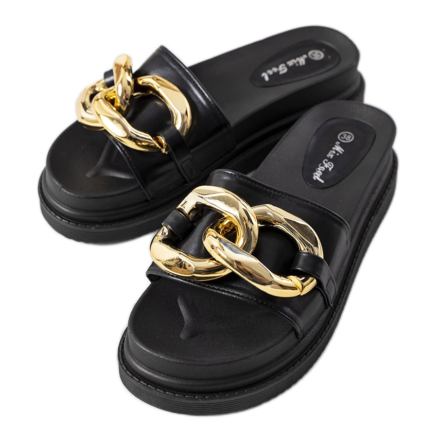 Fabriquées en cuir écologique de haute qualité, les tongs Berloz allient design moderne et fonctionnalité. Le nez rond et la plateforme de 5 cm de hauteur assurent un confort de port, et leur couleur noire classique les permet de s'adapter à tous les styles. Un avantage supplémentaire est une chaîne subtile qui leur confère un caractère original.