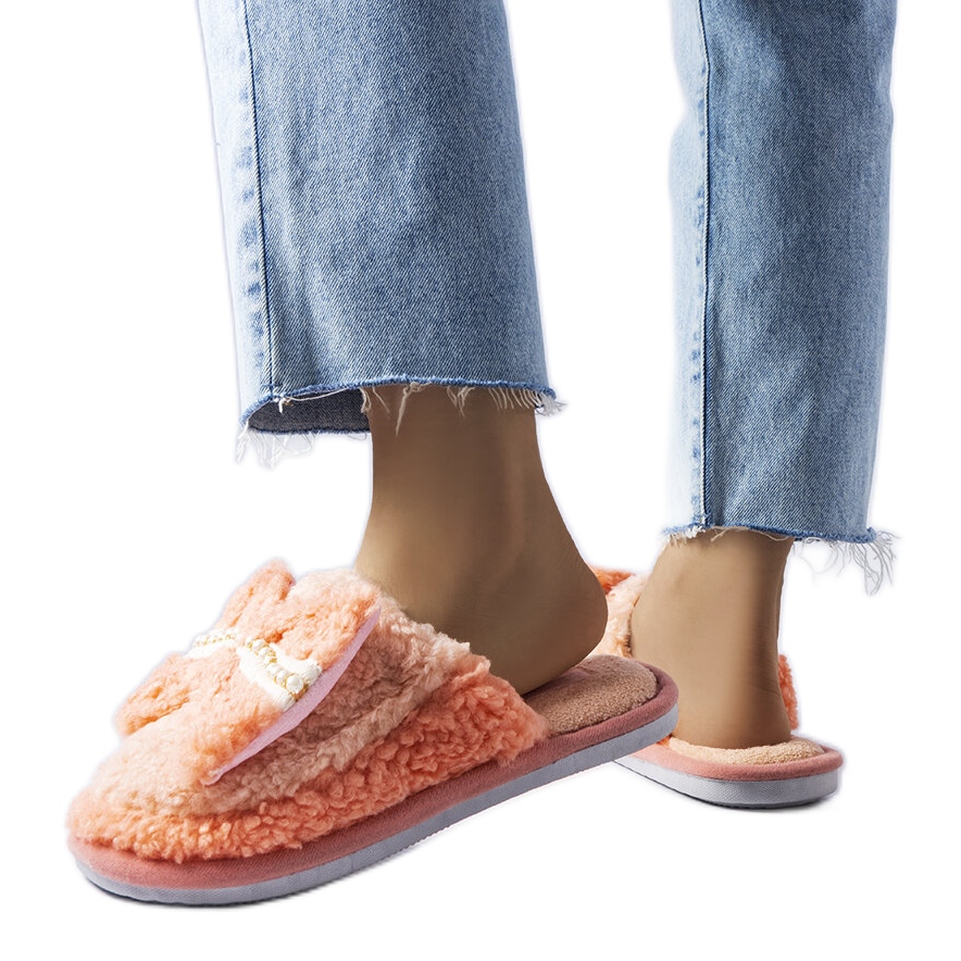 Les pantoufles pour femmes oranges et insérées avec un arc à l'arc décorative sont une combinaison de design à la mode et de confort maximum. L'intérieur isolé et une semelle en caoutchouc blanc adhésif les rendent parfaits comme des pantoufles de maison chaudes les jours plus frais.