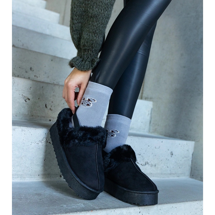 Ces pantoufles se distinguent par un intérieur isolé, qui garantit la chaleur même les jours les plus froids, ce qui en fait un complément parfait à chaque stylisation d'hiver. De plus, la plate-forme de 4,5 cm de haut donne le bon confort lors de la marche, sans abandonner un accent de mode.