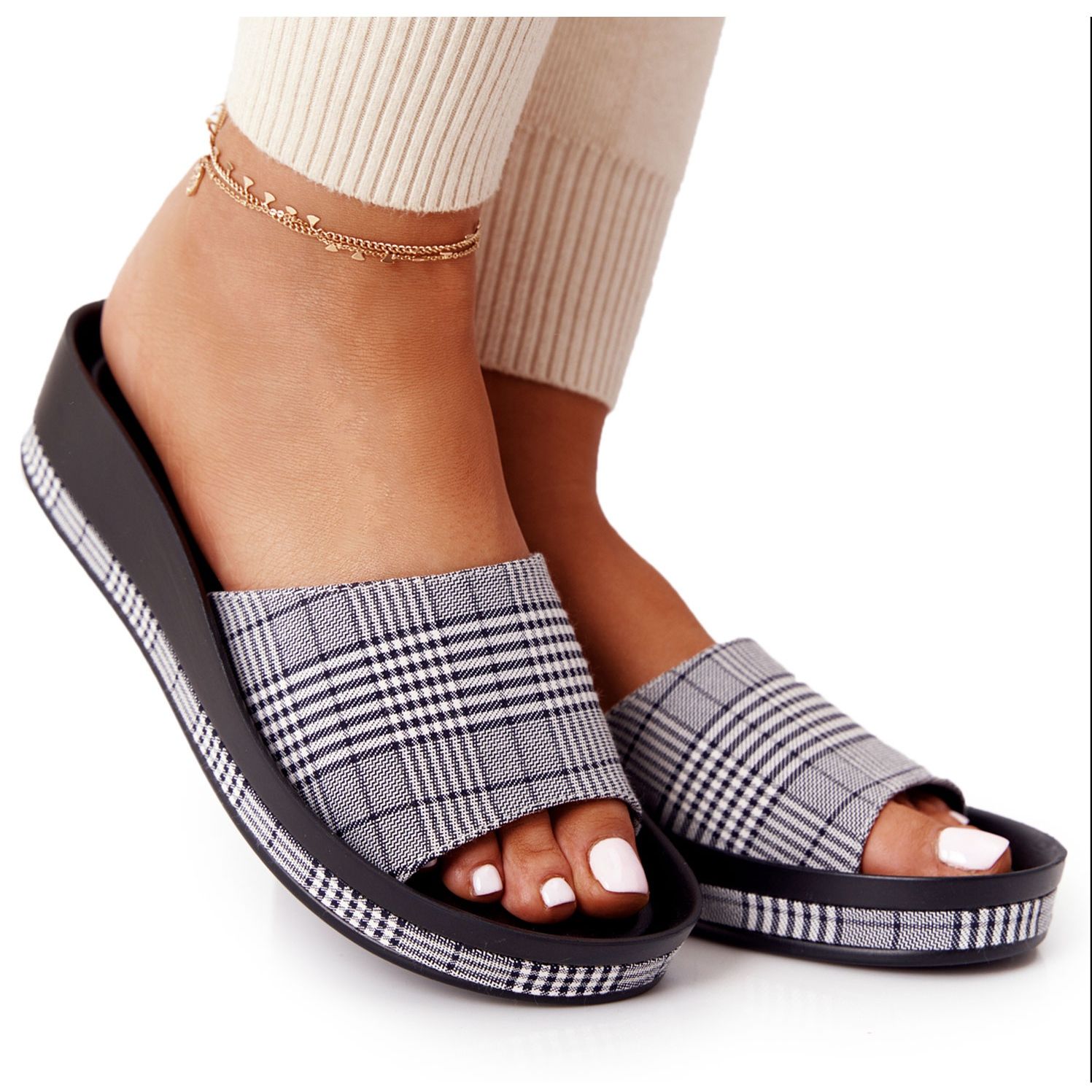 Détails: Chaussons Sur Compensée Vinceza 21-17113 Gris Check blanche le noir