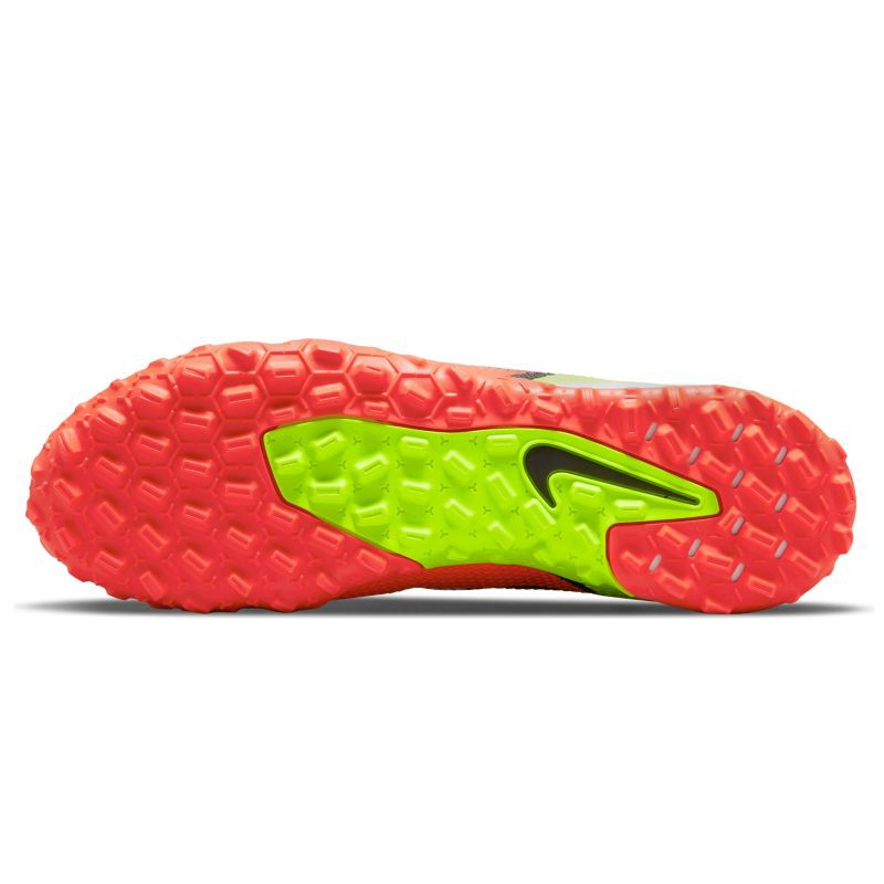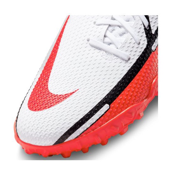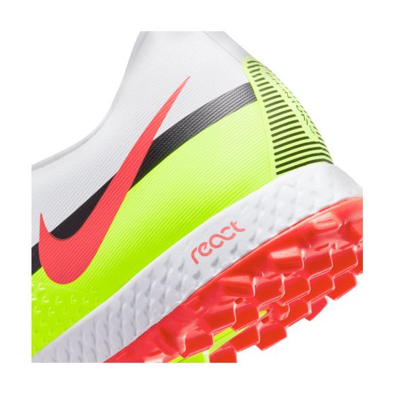 La fixation latérale augmente la zone de contact avec le ballon, ce qui améliore encore la précision et le contrôle. La mousse Nike React intégrée garantit un amorti adéquat, ce qui affecte considérablement le confort d'utilisation, même lors de jeux intenses. La semelle de type TF a été conçue pour jouer sur des surfaces artificielles, ce qui assure une excellente adhérence.