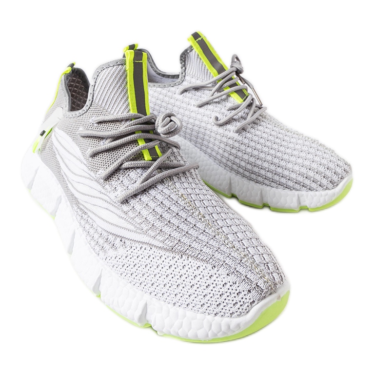Le bout rond introduit un accent visuel unique, rendant les chaussures non seulement fonctionnelles, mais aussi esthétiques. La tige grise, associée à la semelle verte, crée un ensemble harmonieux, et l'ajout de blanc souligne le caractère moderne des chaussures. Le matériau extérieur et l'insert en tissu offrent confort et respirabilité, ce qui en fait un choix idéal pour de nombreuses occasions.