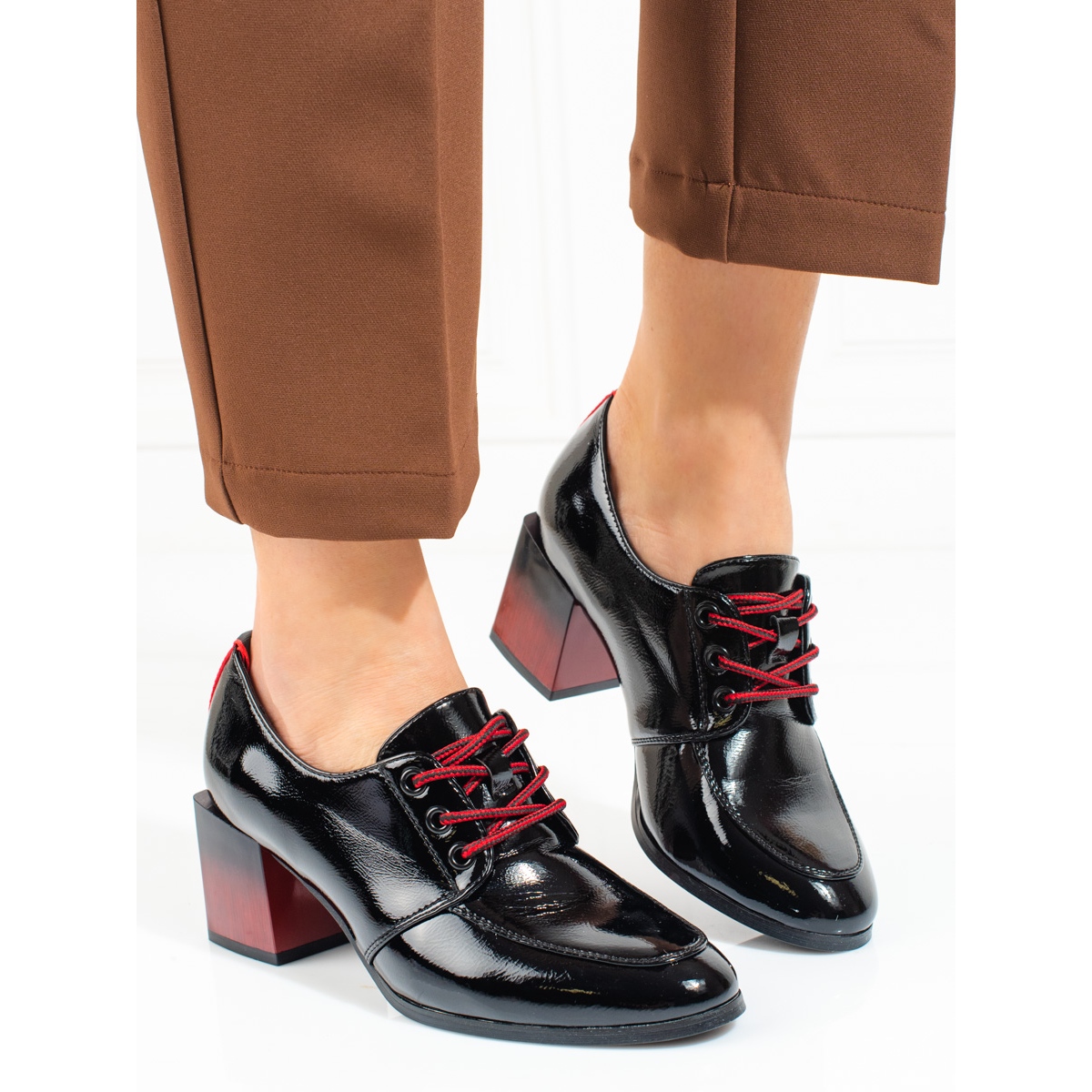 La tige des chaussures est en simili cuir de haute qualité, et leur finition laquée donne un caractère élégant. L'intérieur des chaussures est décoré d'une combinaison de 50 % de cuir naturel et de 50 % de simili cuir, ce qui garantit une ventilation adéquate et une sensation de port agréable. Les semelles en plastique noir et lisse assurent solidité et durabilité, et le bout rond contribue à l'aspect attrayant de la chaussure.