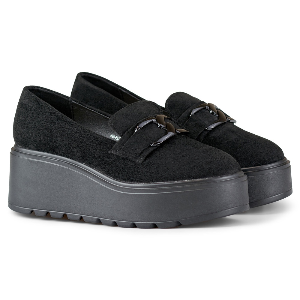 Chaussures noires élégantes pour femmes en daim écologique. Modèle sur un coin stable avec une hauteur de 6 cm, avec une semelle intérieure en cuir qui offre un confort et une meilleure circulation de l'air. La structure insérée le rend plus facile à mettre, et le nez arrondi ajoute un caractère universel - idéal pour les stylisations urbaines quotidiennes.