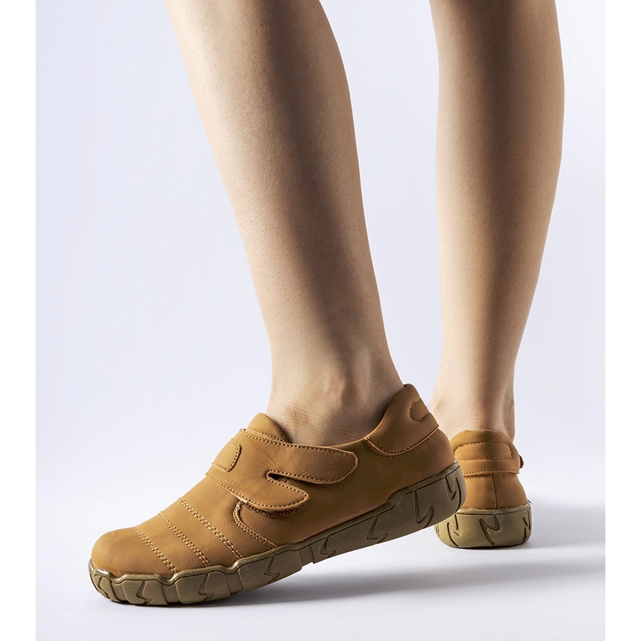 Chaussures féminines élégantes et confortables en chameau (marron). Grâce à la fixation pratique du fermeture scratch, mettre et assortir les chaussures est rapide et sans problème, ce qui en fait le choix parfait pour les sorties quotidiennes et les promenades d'été.