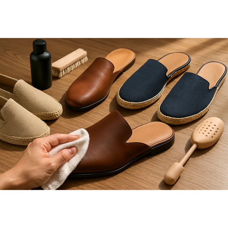 Les mules en cuir doivent être régulièrement nettoyées avec un chiffon humide et imprégnées de préparations pour le cuir afin d'éviter qu'elles ne soient endommagées par l'humidité et le soleil. Les espadrilles et babouchkas en tissu peuvent être nettoyées avec une brosse et du savon, en évitant de détremper la semelle en jute ou en tissé. Il est important d’aérer vos chaussures après chaque utilisation, notamment lorsqu’elles sont portées pieds nus. L’utilisation de tampons parfumés et antibactériens permet de conserver la fraîcheur. Conservez-les dans un endroit frais et aéré, en évitant la lumière directe du soleil.