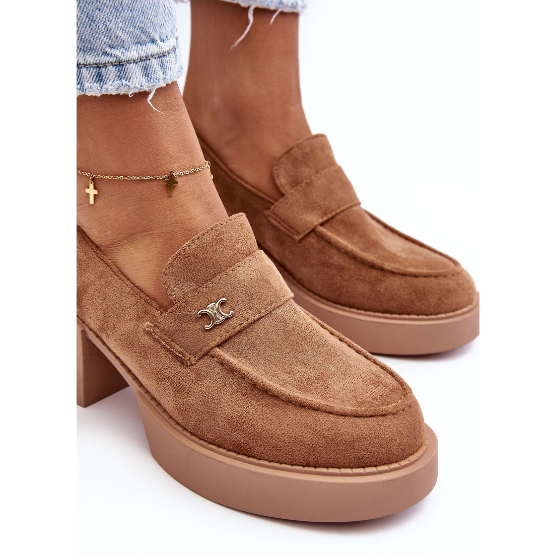 Les chaussures pour femmes de la marque PS1 sont des chaussures à talons hauts en daim beige foncé en forme de bloc. Le talon de 7 cm de haut est stable grâce à une plateforme supplémentaire de 3 cm de haut, également recouverte d'éco-daim. Les chaussures ont des bouts arrondis et un talon raidi, ce qui assure confort et sécurité au porté. Les chaussures sont dotées d'une coupe slip-on et sont ornées d'une bride et d'une petite décoration en plastique sur le devant.