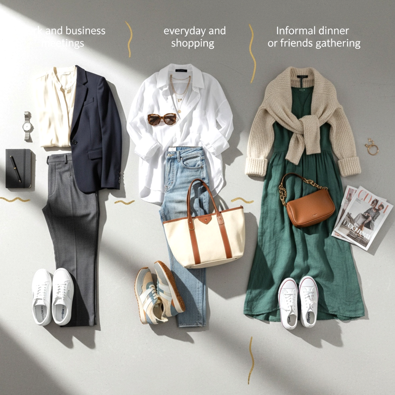 Pour les réunions de travail et d'affaires : Des baskets fines blanches se marient parfaitement avec un pantalon ajusté dans les tons gris ou bleu marine. Pour le haut, choisissez une blouse soyeuse ou une veste minimaliste. Ce style est à la fois professionnel et frais - parfait pour un vendredi décontracté au bureau ou une réunion avec un client dans une industrie créative.