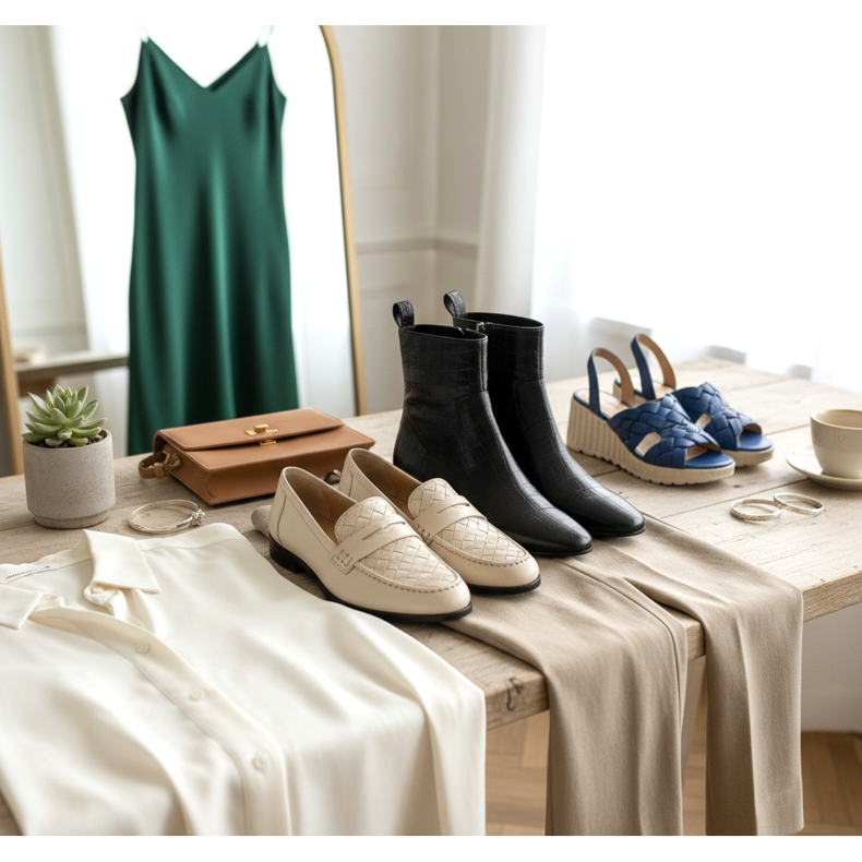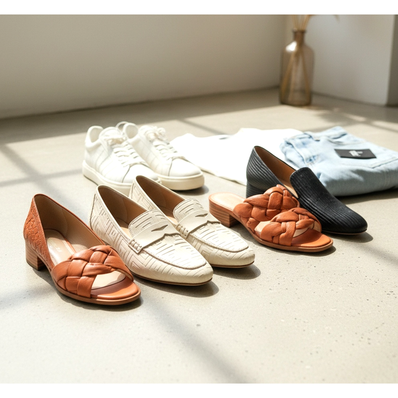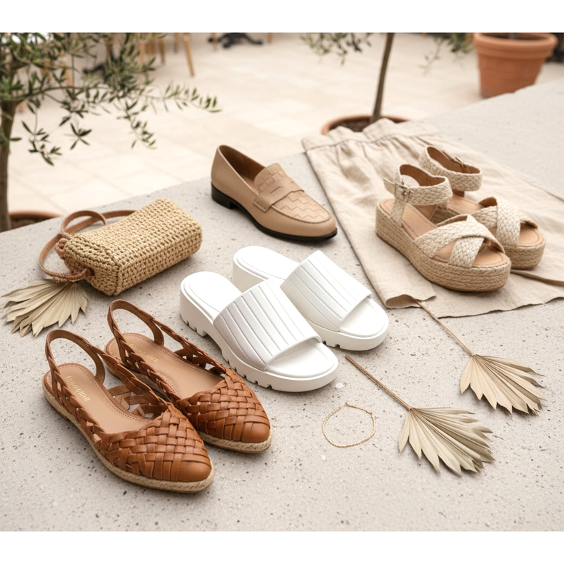 Les chaussures tressées, en revanche, ont une histoire de mode plus longue - il suffit de mentionner les sandales italiennes emblématiques des années 1970. Pour la saison printemps-été 2026, ils reviennent dans des versions élégantes et urbaines : des ballerines composées de lanières de cuir tressées à l'envers, des sandales avec un panier en toile de jute ou des mocassins avec un motif tressé en relief. Associées à des jupes ou des robes en lin, elles créent un effet typique du chic des vacances.