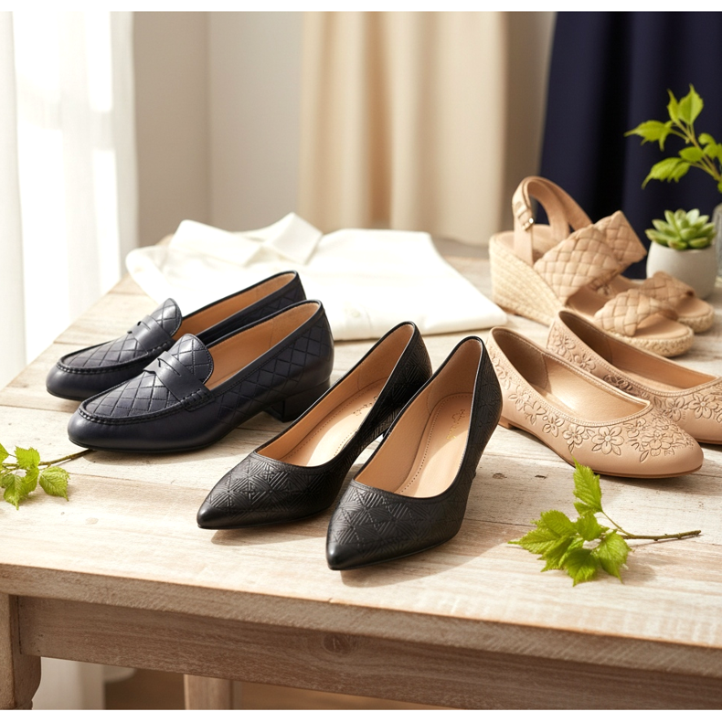 Les reliefs floraux de style bas-relief sont tout aussi populaires : de petites fleurs ou feuilles découpées dans le cuir. Ces modèles sont plus romantiques et féminins. Ils seront superbes avec des ballerines ou des sandales compensées, notamment en beige ou en bleu marine foncé.